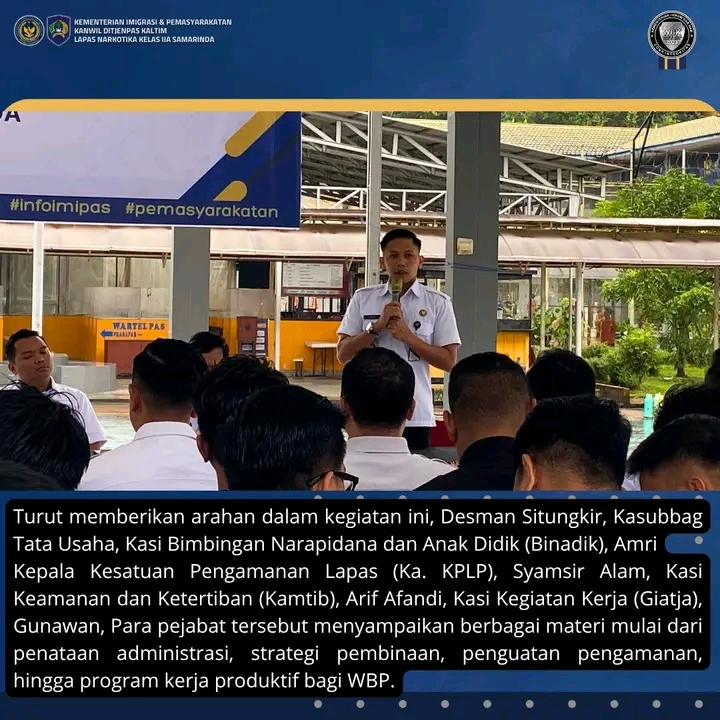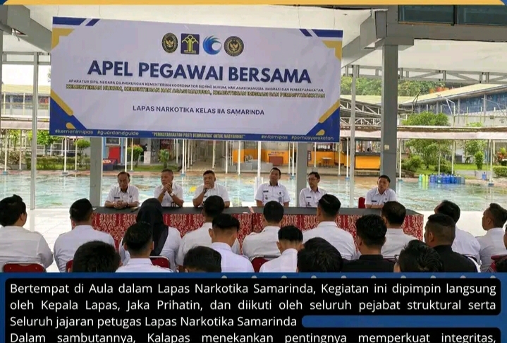 Bertempat di Aula dalam Lapas Narkotika Samarinda, Kegiatan ini dipimpin langsung oleh Kepala Lapas, Jaka Prihatin, dan diikuti oleh seluruh pejabat struktural serta Seluruh jajaran petugas Lapas Narkotika Samarinda