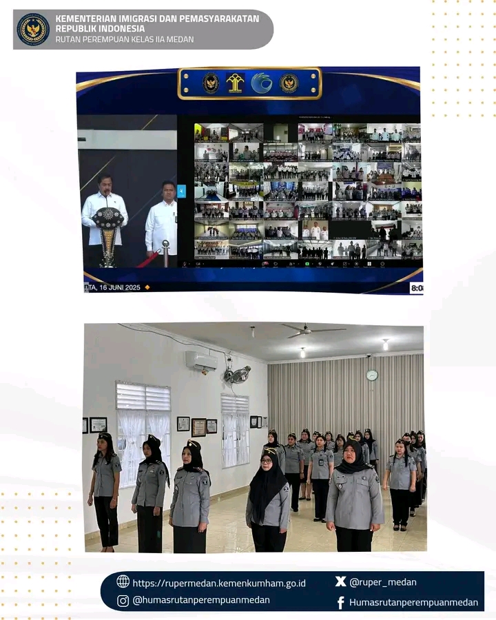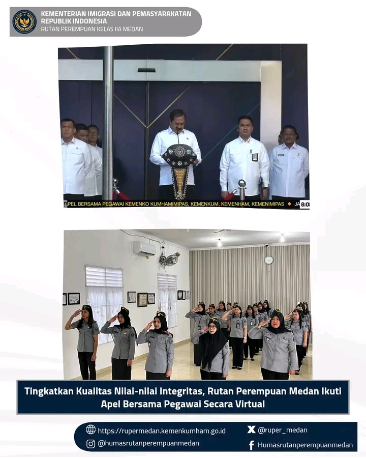 TIMELINES INEWS INVESTIGASI, Medan Sebagai upaya dari peningkatan kualitas nilai-nilai integritas bagi seluruh Aparatur Sipil Negara (ASN), Jajaran Rutan Perempuan Kelas IIA Medan mengikuti pelaksanaan apel bersama secara virtual pada Senin, (16/06). Kegiatan ini diikuti oleh seluruh jajaran di lingkungan Kementerian Koordinator Bidang Hukum, HAM, Imigrasi dan Pemasyarakatan, Kementerian Hukum, Kementerian HAM dan Kementerian Imigrasi dan Pemasyarakatan.