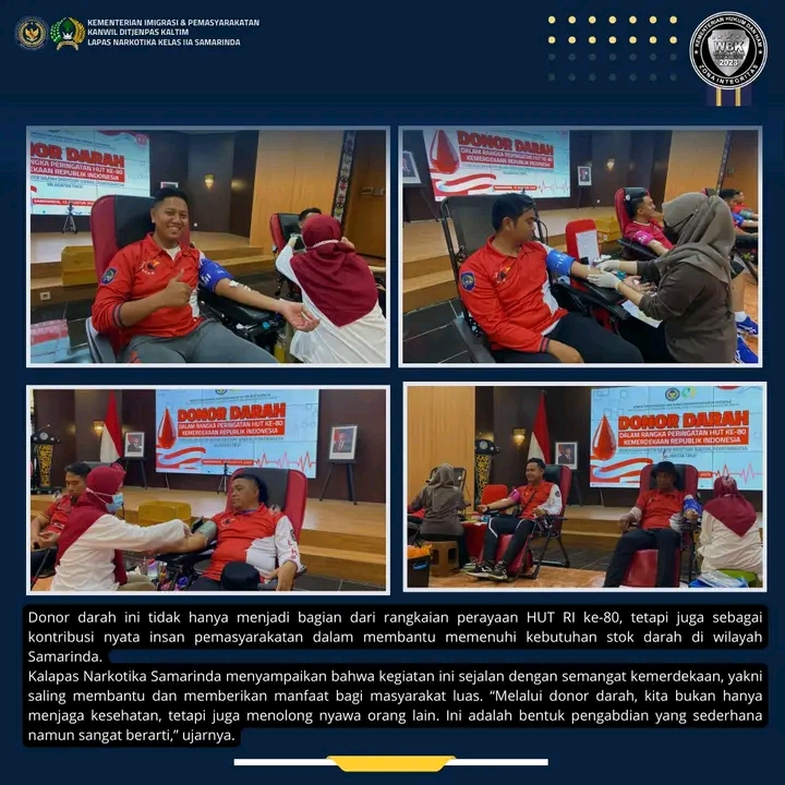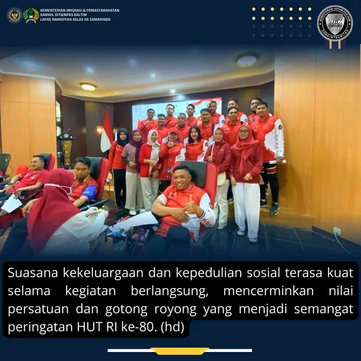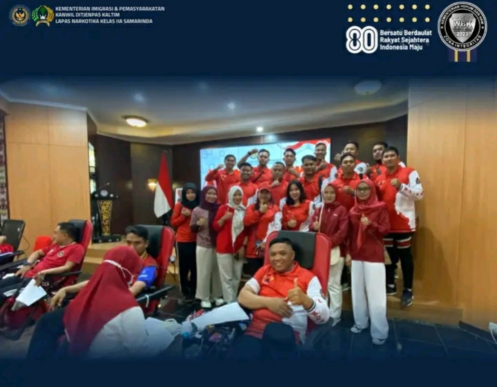 TIMELINES INEWS INVESTIGASI, Samarinda, Dalam rangka memeriahkan Hari Ulang Tahun Kemerdekaan Republik Indonesia ke-80, Kepala Lapas Narkotika Samarinda bersama jajaran turut berpartisipasi dalam kegiatan donor darah yang diselenggarakan oleh Kantor Wilayah Direktorat Jenderal Pemasyarakatan Kalimantan Timur. Jumat (15/8)